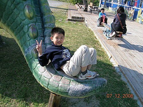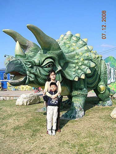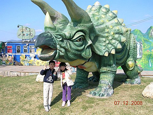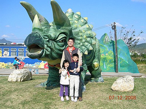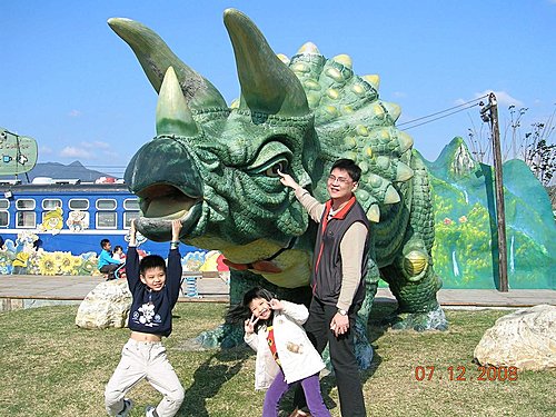 用完中餐後, 離開前到停車場旁的兩節火車和三角龍的塑像前面照照相.