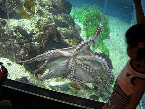 前往參觀亞洲最大級【天保山海遊館】,海遊館建於1990年,至今已飼養了約3580多種的海洋生物;其中一種非常獨特的寒帶生物流冰天使(Clione) 就在這裡可以看到。而依據太平洋生態環建造的大型水族箱,周圍還有14個水族箱包圍著;當中飼養了約3580多種、合計達39000隻的海洋生物。這裡每處均以世界各地不同的海岸命名,如日本的瀨戶內海、南極大陸、美國加洲的蒙特雷灣、澳洲塔斯曼海峽等,幾乎世界上最著名的海洋生物也可在此找到,如各種不同種類的魚、紅海龜、章魚、海豚、鱷魚、水鴨、企鵝、海象、海獺,甚至還有巨咀鳥、松猴及蜥蜴等。