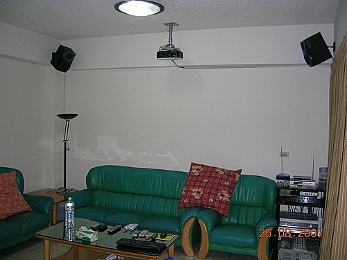 頭頂上的就是SONY的Projector, 搭配舊的喇叭(壁掛架DIY), 前面還有兩個也是舊喇叭(壁掛)
