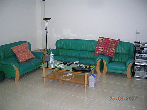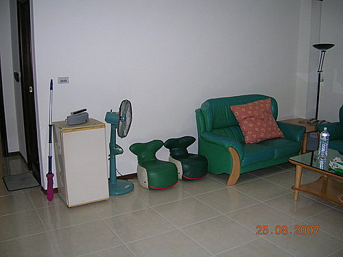 將舊沙發搬到四樓擺好, 搭配一些沒用到的舊家電(立燈和小冰箱)